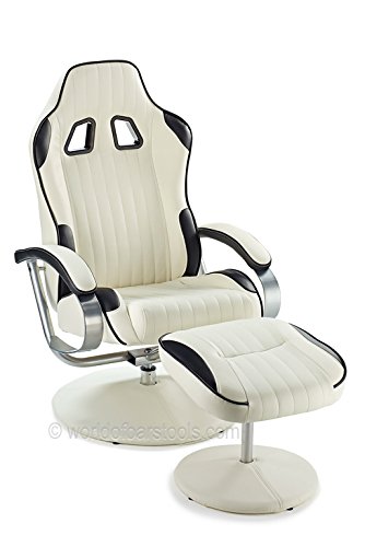 Description : A modern retelling of an all time classic, the RACER CHAIR and footstool is not only incredibly comfortable to sit in, but certainly one of a kind. The Racer Chair takes inspiration from real racing chairs as illustrated with the ventilation holes in the back support, combined with the dashing, modern look of white and black. Furthermore, this chair offers an impressive lumber support along with a tall back rest, and a matching footstool, making this the ideal chair for kicking back and watching television in, or the casual afternoon nap. The Racer chair is also functional for the modern day living room, it swivels 360 degrees and has the ability to set wide a variety of different reclining positions. Both the chair and stool are supplied with a protective rubber base, to protect your floor from scratches and marks